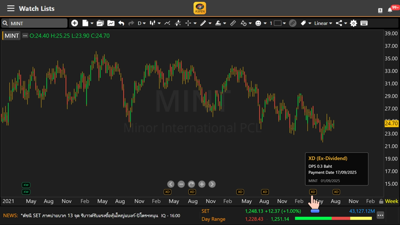 • ดูวันขึ้นเครื่องหมาย XD และเหตุการณ์สำคัญอื่นๆ บนกราฟได้อย่างชัดเจนและครบถ้วน ไม่ว่าจะเป็นหุ้นไทยหรือ DR
