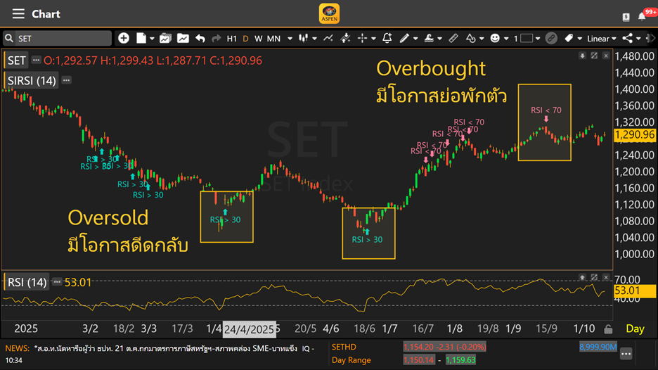 💡 เคล็ดลับ: อย่าดูแค่ค่าตัวเลข ดูบริบทของกราฟด้วยถ้า RSI ที่อยู่เหนือ 70 ในหุ้นขาขึ้นแรง ไม่ได้แปลว่าต้องขายเสมอ