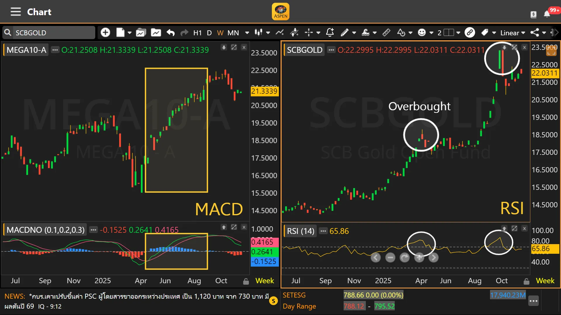 เวลาจะหาจังหวะเข้าออกกองทุน อาจขยับไปดู Time Frame ใหญ่ อย่าง Week หรือ Month เพื่อให้เห็นทิศทางชัดขึ้น จากนั้นค่อยใช้ Indicator ช่วยดูประกอบ เช่น